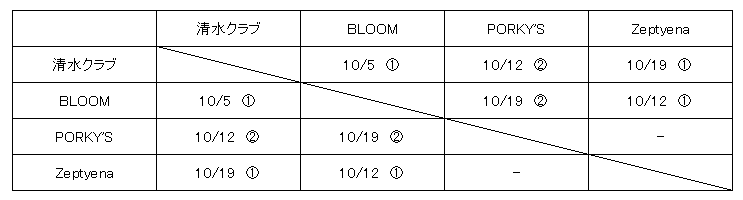 | 10月5日 | ① | 9:30~ | 清水クラブ | BLOOM | 連盟 | 連盟 | 連盟 |