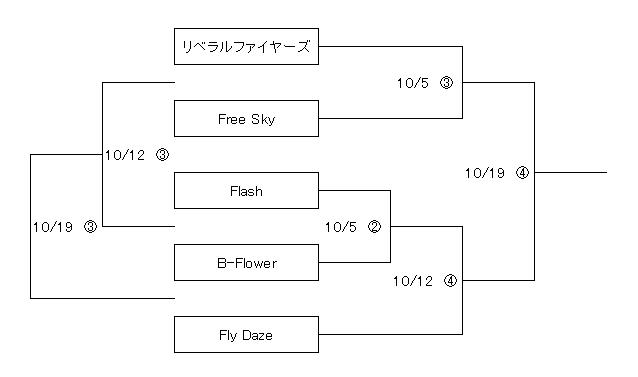 | ④ | 14:00~ | 10/5②の勝 | Fly Daze | ③の両チーム | 10/5②の負 | 10/5③の負 |